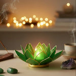 Portacandela a forma di Fiore di Loto, realizzato artigianalmente in conchiglia Capiz e tinto in una  tonalità di verde con bordi dorati. Quando illuminato, crea un'atmosfera di pace e armonia cromatica.