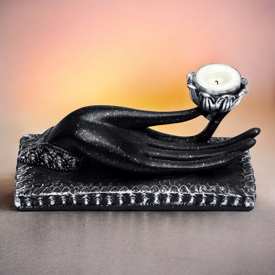 Portacandela Mudra Gyan è una raffinata scultura a forma di mano che rappresenta il gesto simbolico del Gyan Mudra, associato alla pace mentale, alla fiducia in se stessi e alla purezza.