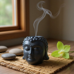 Brucia Essenze Testa di Buddha Nera in ceramica, elegante e simbolico, ideale per diffondere oli essenziali, cere profumate o fragranze. Perfetto per creare un’atmosfera meditativa, armoniosa e rilassante in casa o nello spazio dedicato alla spiritualità.
