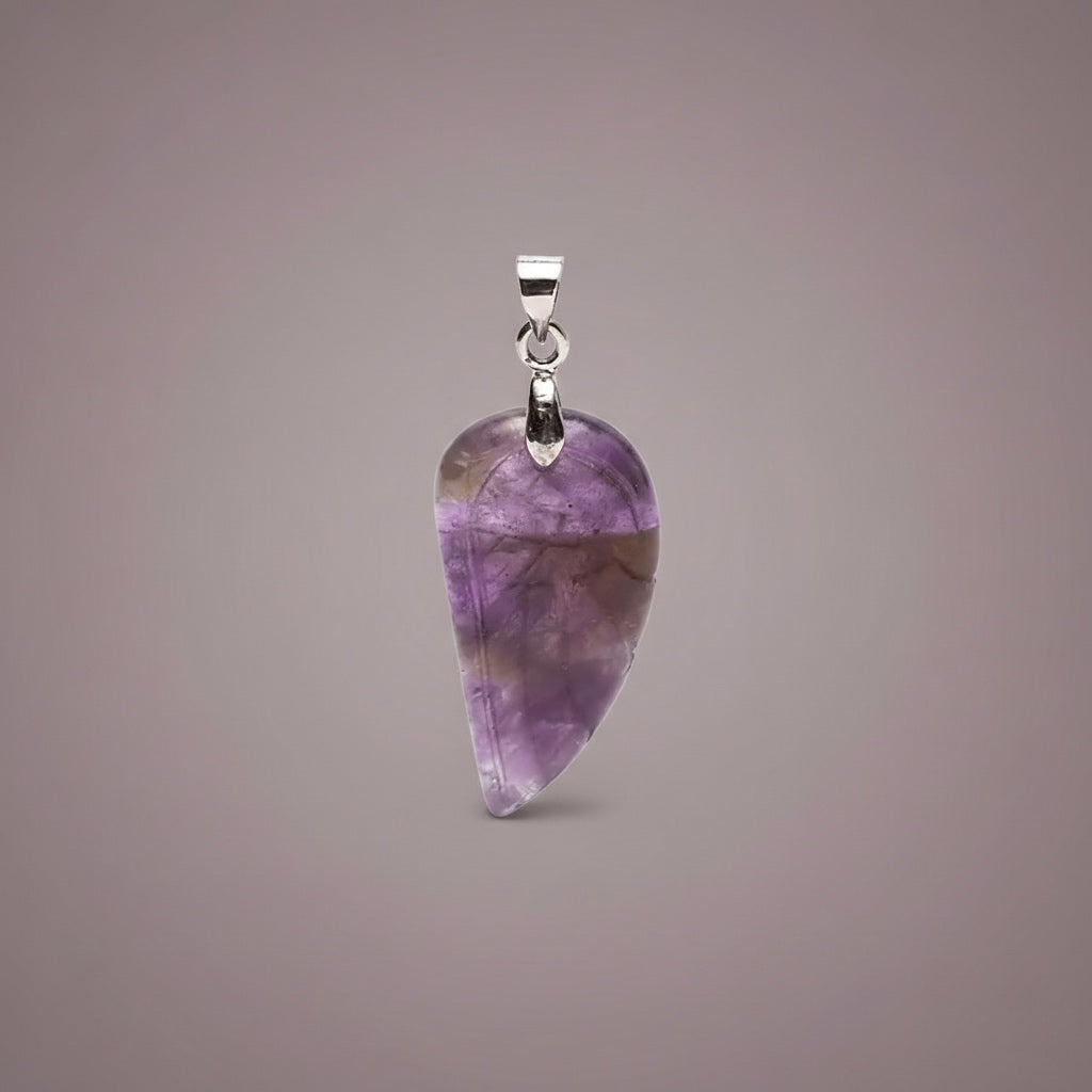 Ciondolo in Ametista naturale a forma di ala d’angelo, simbolo di protezione, guida e serenità. La superficie levigata e la venatura tipica del cristallo rendono ogni pezzo unico e ricco di carattere.