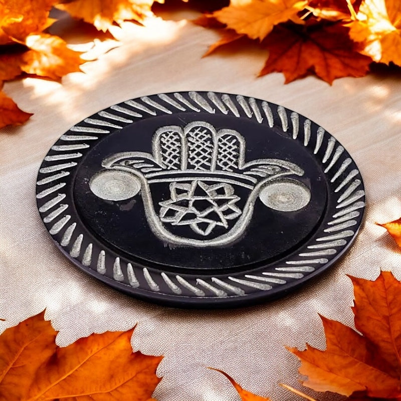 Il Brucia Incensi con Mano di Fatima è realizzato in pietra ollare nera, finemente intarsiata a mano. Il design compatto da 10 cm lo rende perfetto per l’uso quotidiano, sia con incensi a bastoncino che a cono.