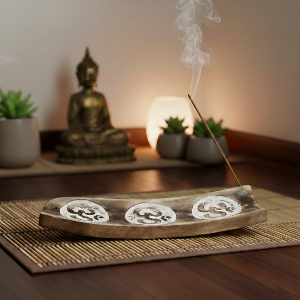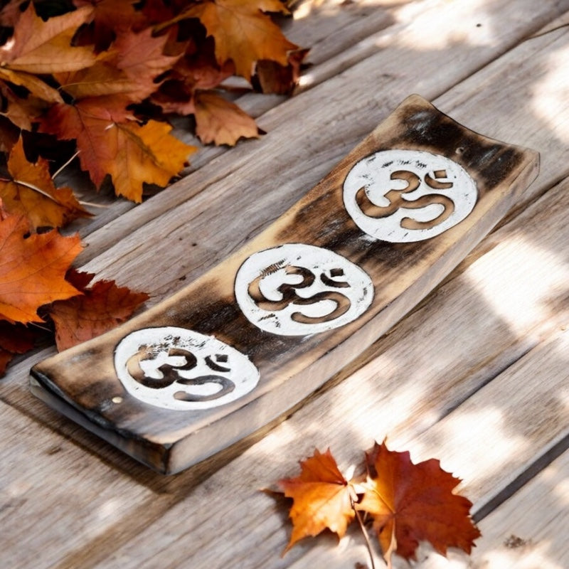 Brucia incenso in legno con simbolo Om intarsiato a mano, ideale per bastoncini di incenso. Un accessorio che unisce funzionalità e spiritualità in ogni ambiente.