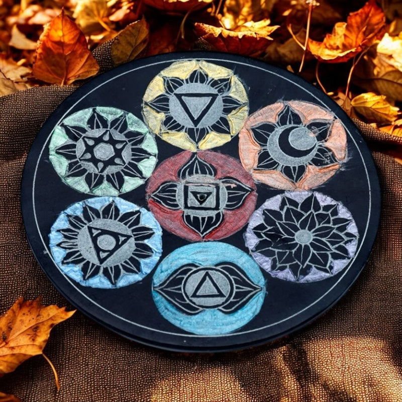 Brucia incenso Chakra in pietra ollare decorato con i simboli dei 7 Chakra. Un accessorio artigianale ideale per accompagnare momenti di meditazione e introspezione, o semplicemente per creare un’atmosfera serena in casa.