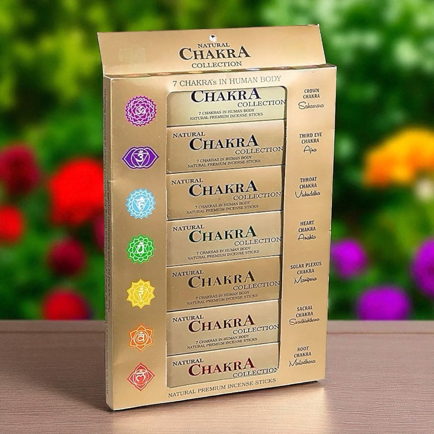Collezione di Incensi 7 Chakra in confezione regalo, con 7 miscele naturali dedicate a ciascun Chakra. Ideale per meditazione, rilassamento e riequilibrio energetico.