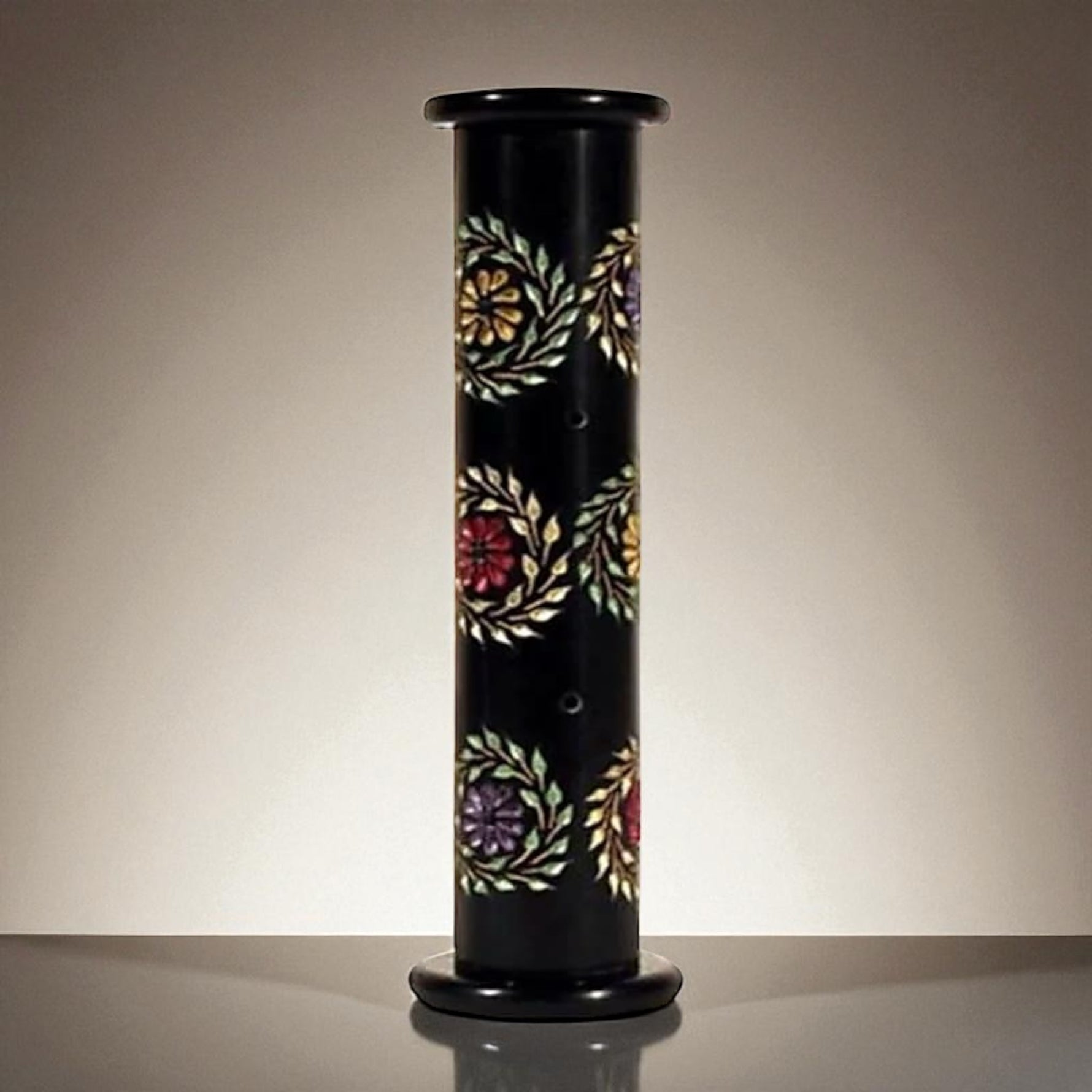 Brucia incensi a colonna in pietra ollare nera lucida, decorata con eleganti fiori incisi. Mantiene i bastoncini in posizione verticale, creando un effetto scenografico unico mentre il fumo si diffonde.