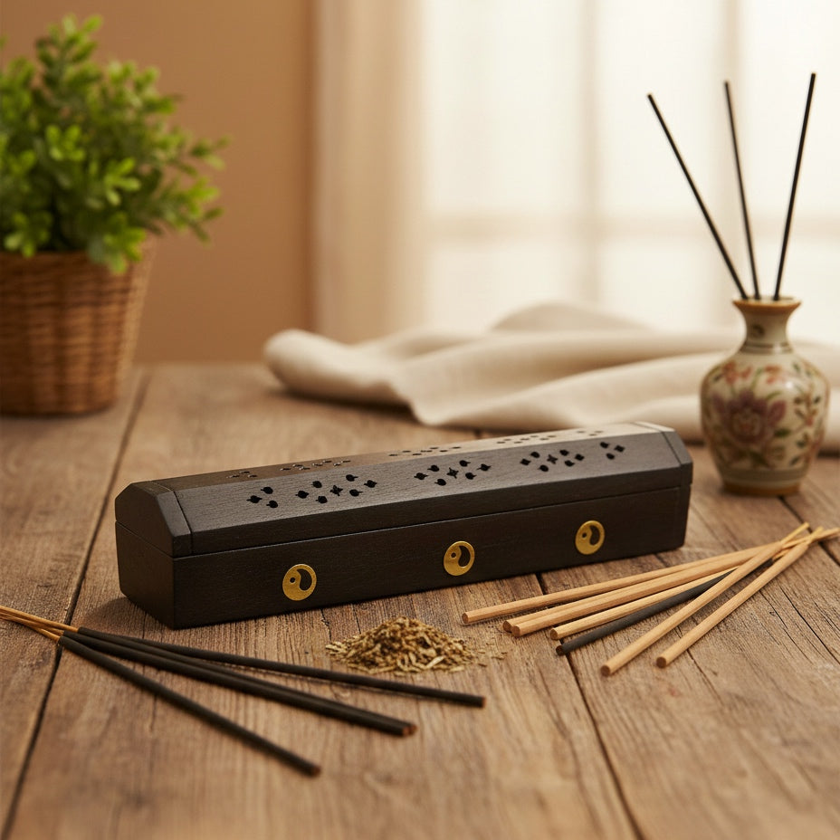 Portaincenso in legno nero con simbolo Yin Yang, rifinito con dettagli dorati. La scatola presenta fori decorativi che permettono alla fragranza di diffondersi in modo omogeneo.