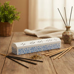 Portaincenso in legno intagliato con design bianco decorato, adatto per bruciare bastoncini e coni. La scatola da 30 cm permette una combustione sicura e la raccolta ordinata della cenere.