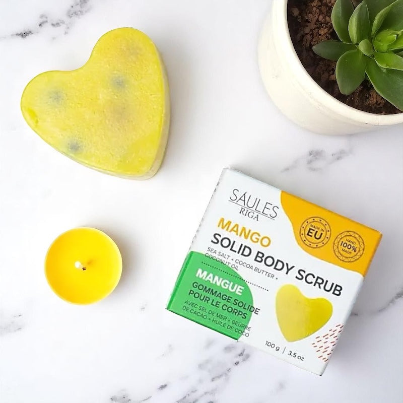 Il Sapone Scrub Naturale al Mango di Saules Fabrika è un trattamento esfoliante solido fatto a mano, perfetto per rivitalizzare e nutrire la pelle. Formulato con sale marino, burro di cacao e olio di cocco, è arricchito con grani di azuki che stimolano la circolazione e massaggiano delicatamente la pelle. La profumazione tropicale al mango lo rende ideale per un momento di benessere energizzante.